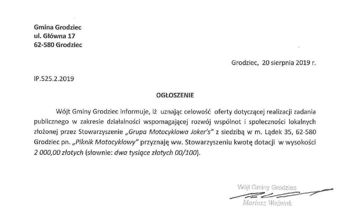 Stowarzyszenie „Grupa Motocyklowa Joker’s” z siedzibą w m. Lądek 35, 62-580 Grodziec złożyło ofertę na realizację zadania publicznego pn. „Piknik Motocyklowy” w trybie art. 19a ustawy z dnia 24 kwietnia 2003 r. o działalności pożytku publicznego i o wolontariacie (Dz. U. z 2016 r., poz. 1817 z późn. zm.) zwanej w dalszej części „ustawą” (tryb z pominięciem otwartego konkursu ofert, tzw. „Małe Granty”).