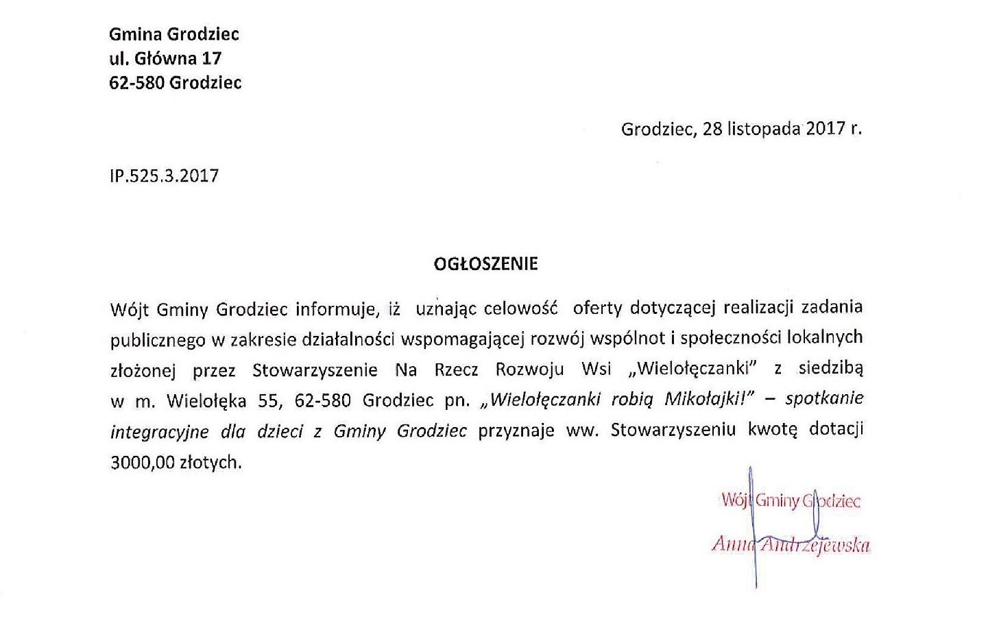Stowarzyszenie Na Rzecz Rozwoju Wsi „Wielołęczanki” z siedzibą w m. Wielołęka 55, 62-580 Grodziec złożyło ofertę na realizację zadania publicznego pn. „Wielołęczanki robią Mikołajki!” – spotkanie integracyjne dla dzieci z Gminy Grodziec w trybie art. 19a ustawy z dnia 24 kwietnia 2003 r. o działalności pożytku publicznego i o wolontariacie (Dz. U. z 2016 r., poz. 1817 z późn. zm.) zwanej w dalszej części „ustawą” (tryb z pominięciem otwartego konkursu ofert, tzw. „Małe Granty”).