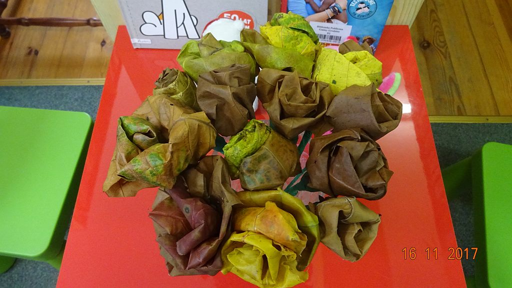 W tajniki rękodzieła artystycznego wprowadziły dzieci – zaproszone specjalnie na tę okazję – członkinie Klubu Seniorów Ale Babki Grodzieszczanki. Pani Halina i Pani Irena w prosty sposób pokazały jak wykonać ciekawe kompozycje z liści klonu, dębu. Zaprezentowały też różne techniki zwijania liści i tworzenia z nich bukietów.