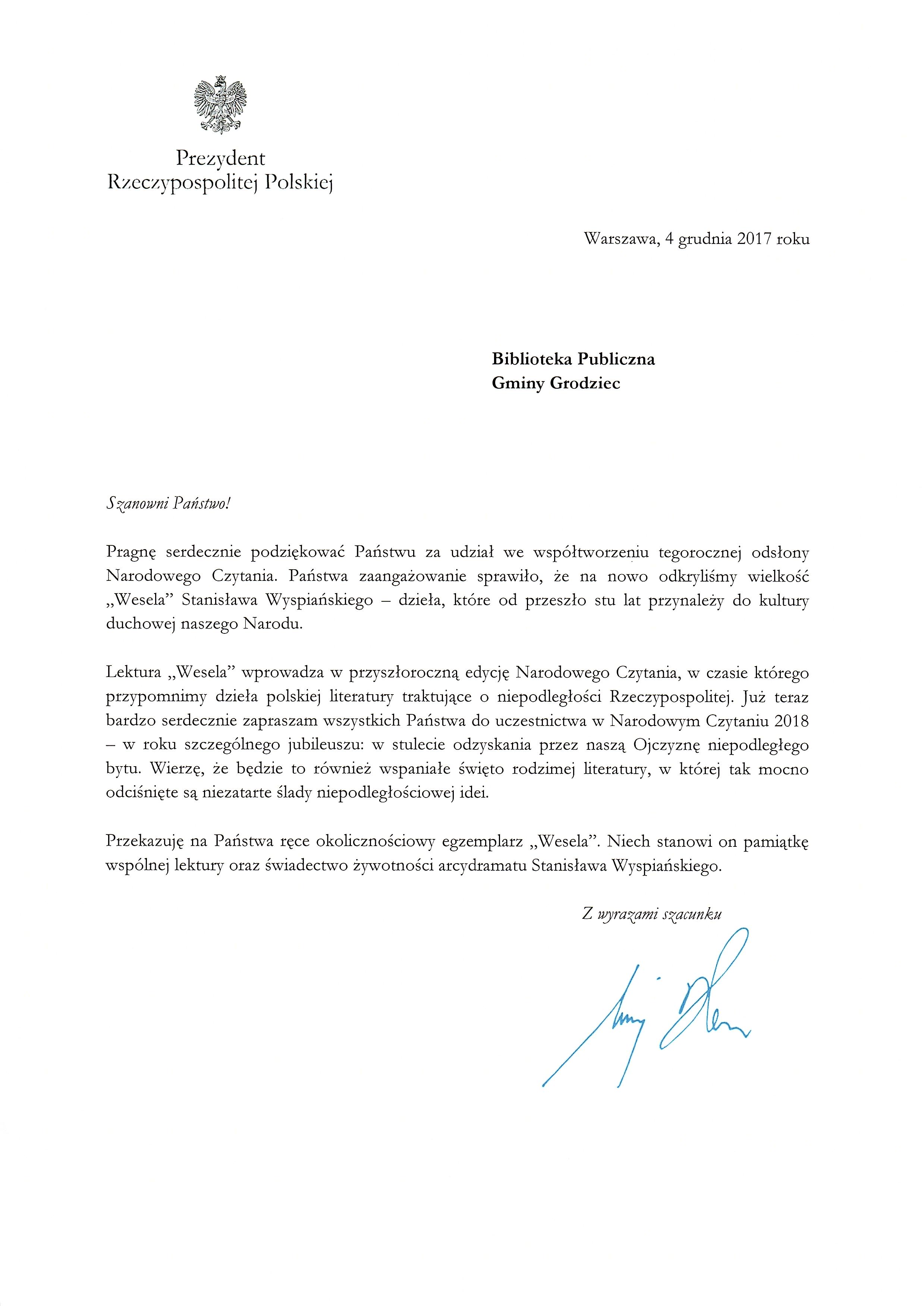 Niezmiernie miło nam poinformować, że Biblioteka Publiczna Gminy Grodziec po raz kolejny otrzymała podziękowanie i upominek z Kancelarii Prezydenta Rzeczpospolitej Polskiej za włączenie się w ogólnopolską akcję Narodowe Czytanie 2017. Przypomnijmy, że w ramach tegorocznej odsłony Narodowego Czytania, na nowo odkryliśmy wielkość „Wesela” Stanisława Wyspiańskiego – dzieła, które od ponad wieku przynależy do kultury duchowej naszego Narodu.