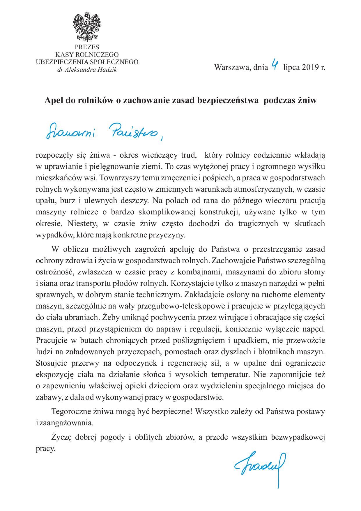 Apel Pani Prezes KRUS dot. bezpieczeństwa podczas żniw