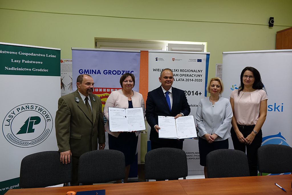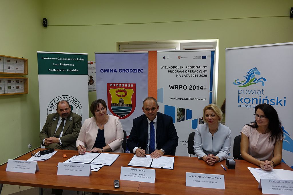 17 października 2018 r. w siedzibie Nadleśnictwa Grodziec przy ul. Leśnej 50, podczas konferencji prasowej, Maciej Sytek - Członek Zarządu Województwa Wielkopolskiego podpisał umowę z Wójtem Gminy Grodziec Anną Andrzejewską na dofinansowanie z Wielkopolskiego Regionalnego Programu Operacyjnego 20014-2020 projektu pt. ,,Samorządy i Lasy Państwowe- razem dla grodzieckiej przyrody’’. Gmina Grodziec otrzymała wsparcie w wysokości blisko 800 tys. zł, przyznane przez Zarząd Województwa Wielkopolskiego na rozbudowę Ośrodka Edukacji Leśnej w Grodźcu, budowę edukacyjnej ścieżki ekologicznej w ciągu drogi powiatowej prowadzącej do Ośrodka Edukacji Leśnej, jej wyposażenie oraz budowę tzw. terenowych punktów edukacyjnych. Dofinansowane zostaną także wycieczki edukacyjne i warsztaty ekologiczne. Projekt realizowany jest w partnerstwie z Powiatem Konińskim i Państwowym Gospodarstwem Leśnym Lasy Państwowe Nadleśnictwo Grodziec. Celem przedsięwzięcia jest promowanie zasad zrównoważonego rozwoju poprzez organizację przestrzeni publicznej, wpisującej się w lokalny krajobraz oraz podnoszenie poziomu świadomości ekologicznej i kształtowaniu postaw ekologicznych mieszkańców gminy.